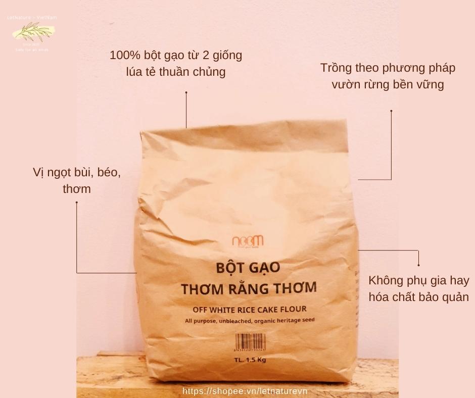 Bột gạo Thơm Rằng Thơm là giống lúa tẻ thuần chủng tại địa phương, có vị ngọt bùi, và mùi thơm gạo rất đặc trưng. Lúa Thơm Rằng Thơm được trồng theo phương pháp vườn rừng bên vững tại farm Rơm Vàng của Noom. Bột gạo TRT đa dụng rất hữu ích cho các chị em nội trợ. Ứng dụng từ nấu cháo, nấu soup, pha sữa đến làm các loại bánh đều rất thơm ngon, hấp dẫn. Bột Gạo Đa Dụng Thơm Rằng Thơm là 100% bột gạo từ 2 giống lúa bản địa trứ danh tại Quảng Nam CÔNG DỤNG Là bột gạo đa năng chuyên làm dùng để làm các loại bánh, các sợi bột gạo truyền thống như : bánh xèo, bánh bèo, nậm, bánh canh, bánh bò, bún mì phở, nấu cháo, nấu bột ăn dặm cho trẻ, bột chiên giòn… CHẤT LƯỢNG Lúa nước trồng 4 tháng, tại farm vườn rừng Rơm Vàng. Phương pháp trồng cổ truyền từ nền văn minh cổ đại lúa nước. Sau khi thu hoạch phơi khô bảo quản lưu kho tự nhiên – bóc vỏ xát dối- xay mịn- đóng bao .Trong cả quy trình sơ chế, chế biến hoàn toàn không thêm bất kì phụ gia hay hóa chất bảo quản. HƯỚNG DẪN SỬ DỤNG 100gr bột gần tương đương với 120gr gạo. Nấu cháo đặc Làm bánh xèo Làm bánh bèo, bánh cuốn Làm bánh canh, bánh gạo Hàn Quốc dạng sợi Làm bánh giò, bánh nậm, bánh gói Bột gạo Thơm Rằng Thơm có thể dùng để làm bánh bò, bánh gạo, pha bột chiên giòn và nhiều món ăn khác. HƯỚNG DẪN BẢO QUẢN Bột gạo TRT được xát dối và không bất kì chất bảo quản nên bột rất ngọt, béo và thơm , điều này cũng khiến cho các vi sinh vật khác cũng rất thèm . Nên để bảo quản tốt nhất bỏ gói bột gạo vào túi ni lông cột chặt và trữ trong tủ lạnh thì hạn sử dụng 12 tháng Để bên ngoài 45 ngày.