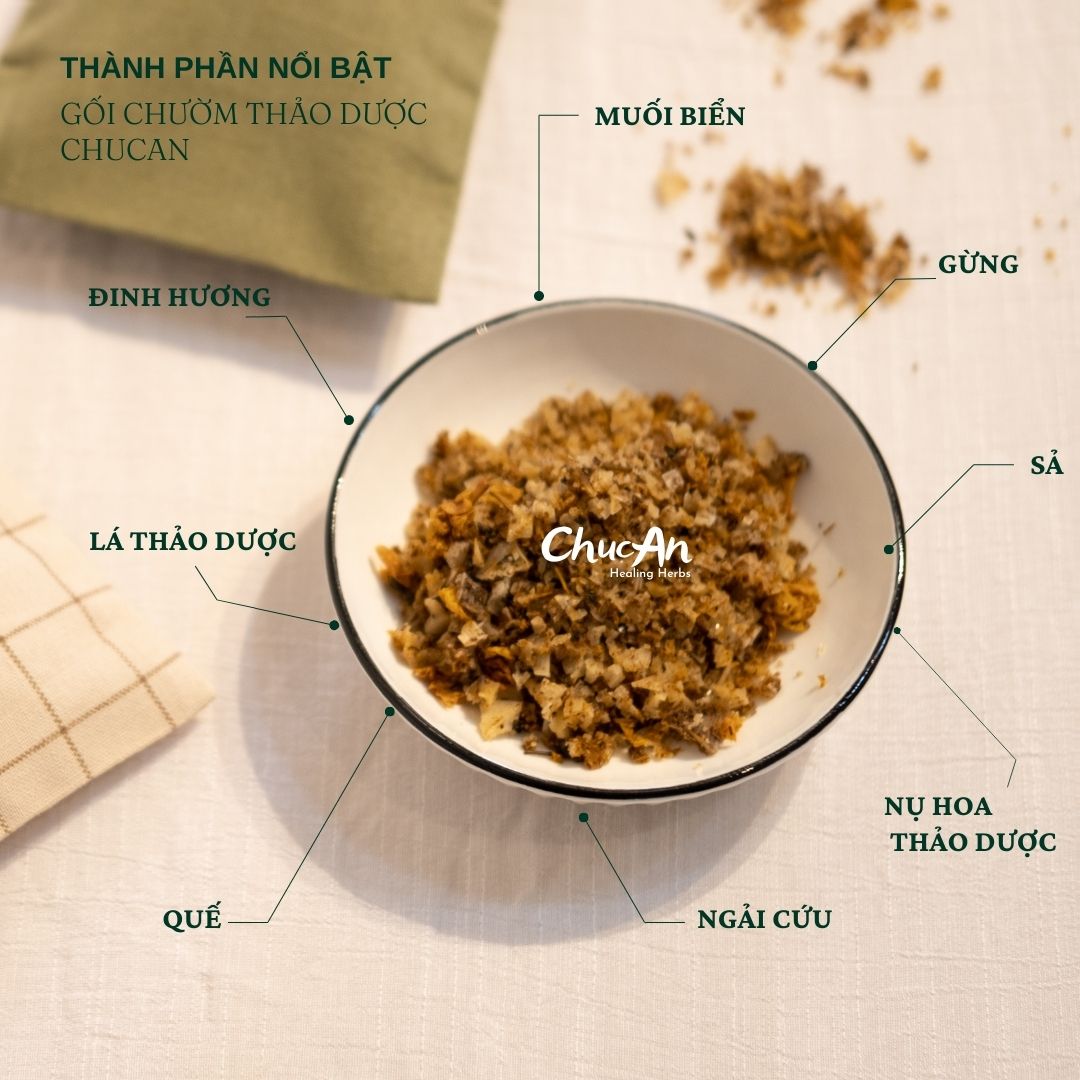 Thành phần ruột gối: Muối biển, ngải cứu, gừng, sả, nghệ, quế, đinh hương, lá thảo dược, nụ hoa thảo dược.
